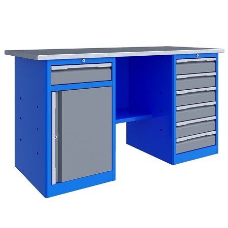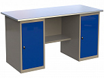 Верстак двухтумбовый поставляется в разобранном виде (4 элемента). Нагрузка на столешницу до 600 кг. Стандартный цвет: корпус - серый глянец RAL 7030, ящики и двери тумб - синий RAL 5017. Размеры:855x1400x700 мм. Масса: 81 кг.