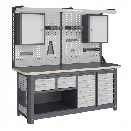 Однотумбовый. Допустимая нагрузка на столешницу 750 кг. Опорные элементы выполнены сварными из холоднокатаной стали. Для выполнения сборочных, ремонтных, слесарных, монтажных и других видов работ на производстве, в сервисных центрах, мастерских, гаражах, а также для обучения технологии в учебных заведениях. Комплектуется полкой-стенкой, расположенной под столешницей для удобного размещения габаритного инструмента и оснастки. Размеры верстака: 855x1596x696 мм. Вес: 81 кг. Поставляется в 4 комплектациях на выбор.