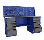 Двухтумбовый. Допустимая нагрузка на столешницу 1000 кг. Опорные элементы выполнены сварными из холоднокатаной стали. Для выполнения сборочных, ремонтных, слесарных, монтажных и других видов работ на производстве, в сервисных центрах, мастерских, гаражах, а также для обучения технологии в учебных заведениях. Комплектуется полкой-стенкой, расположенной под столешницей для удобного размещения габаритного инструмента и оснастки. Размеры верстака: 855x1796x696 мм. Вес: 123 кг. Поставляется в 4 комплектациях на выбор.