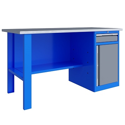 Верстак однотумбовый поставляется в разобранном виде. Нагрузка на столешницу до 600 кг. Стандартный цвет: корпус - серый глянец RAL 7030, ящики и двери тумб - синий RAL 5017. Размеры:855x1400x700 мм. Вес: 65 кг.