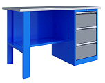 Однотумбовый. Допустимая нагрузка на столешницу 750 кг. Опорные элементы выполнены сварными из холоднокатаной стали. Верстак состоит из столешницы, опоры, тумбы P3 с тремя большими ящиками и полки-стенки. Все металлические элементы покрыты полиэфирной порошковой краской. Столешница состоит из фанеры марки ФСФ толщиной 24 мм, которая покрыта лаком-антисептиком и листом оцинкованной холоднокатаной стали толщиной 1,2 мм. Размеры (ВхШхГ) 855x1396x696 мм.