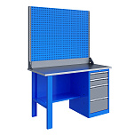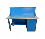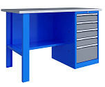 Однотумбовый. Допустимая нагрузка на столешницу 750 кг. Опорные элементы выполнены сварными из холоднокатаной стали. Верстак состоит из столешницы, опоры, тумбы P5 с четырьмя малыми и одним большим ящиком, полки-стенки и одинарного экрана с кронштейнами. Все металлические элементы покрыты полиэфирной порошковой краской. Столешница состоит из фанеры марки ФСФ толщиной 24 мм, которая покрыта лаком-антисептиком и листом оцинкованной холоднокатаной стали толщиной 1,2 мм. Размеры (ВхШхГ) 1470x1396x696 мм.
