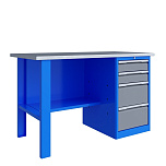 Однотумбовый. Допустимая нагрузка на столешницу 750 кг. Опорные элементы выполнены сварными из холоднокатаной стали. Верстак состоит из столешницы, поры, тумбы P4 с двумя малыми и двумя большими ящиками, полки-стенки и одинарного экрана с кронштейнами. Все металлические элементы покрыты полиэфирной порошковой краской. Столешница состоит из фанеры марки ФСФ толщиной 24 мм, которая покрыта лаком-антисептиком и листом оцинкованной холоднокатаной стали толщиной 1,2 мм. Размеры (ВхШхГ) 1470x1396x696 мм.