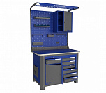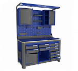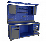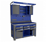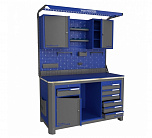 Нагрузка на столешницу 1500 кг. Столешница из листа влагостойкой фанеры марки ФСФ толщиной 40 мм и листом горячекатаной стали толщиной 5 мм. Рама верстака выполнена их холоднокатаной стали. Модуль верстака выполнен сварными. Ящики в модулях устанавливаются на шариковых телескопических направляющих полного выдвижения. Квадратная перфорация для установки крючков, держателей. Размеры: 1982x1493x743 мм