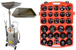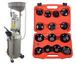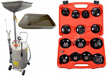 Комплект из TS-2081 маслосборника. Для быстрого слива (самотеком) масла и антифриза из ДВС, КПП и мостов всех авто. В комплекте: Сливная чаша. Лоток для сливной пробки. Металлический пистолет для откачки масла. Обрезиненная ручка для транспортировки. Колёса пластиковые – 2 прямых + 2 поворотных позволяет перемещать по любой поверхности цеха. Вмещает 90 л. + ES0901 Набор съемников масляных фильтров ("чашки") - 15 шт.