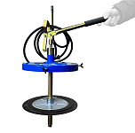 Солидолонагнетатель ручной, для бочек 20-60 кг, для густой смазки. Комплект оснащен тележкой для бочек 20-60 кг., насос для смазки ручной производительностью 300 гр/мин, мембрана и крышка для солидолонагнетателя, шланг 4 м, раздаточный пистолет с наконечником. При давлении воздуха 6-8 Атм давление смазки 400 Атм максимально. Колёса: 2 прямых. Масса: 12 кг.