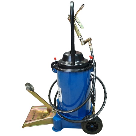 Пневматический. На колесах. Продавливает «ЗАБИТЫЕ» тавотницы. Давление смазки 350-400 Атм. Пистолет с наконечником под тавотницы производительность 850 г/мин. Для шприцевания шарнирных соединений (тавотниц, крестовин, подшипников, цепей). Заправка смазкой из ведра, тубы, бочки. Вес 14 кг. Длина шланга 4 м. Емкость бака 13 кг.
