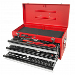 Данный набор инструмента включает: тележку инструментальную с 4 ящиками, комбинированные ключи, наборы головок и отверток, клещи, утконосы, щипцы и трещотку - это тот самый минимум, который понадобится при работе в гараже или СТО.
