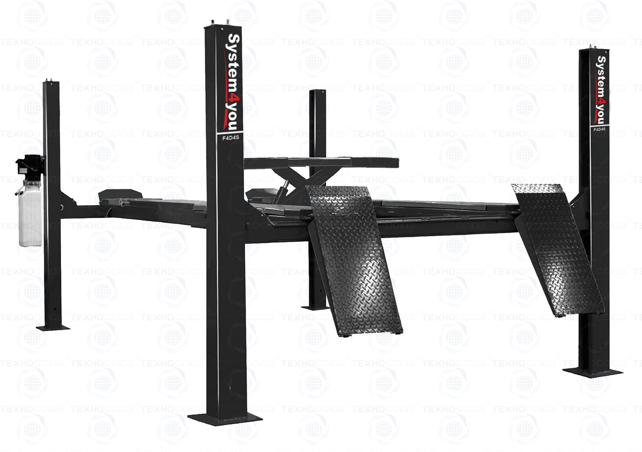 F4D4S - четырехстоечный электрогидравлический подъемник грузоподъемностью до 4 тонн, предназначен для подъема легковых автомобилей, внедорожников и легкого коммерческого транспорта с последующей фиксацией на рабочей высоте для проведения слесарных работ и сход-развальных работ с технологией 3D, так и без неё, а также с прокаткой. Автомобильный подъемник оснащен траверсой с управлением через кран на главной стойке. Длина платформ: 4700 мм. Расстояние между колонн: 2850 мм. Вес: 1115кг.