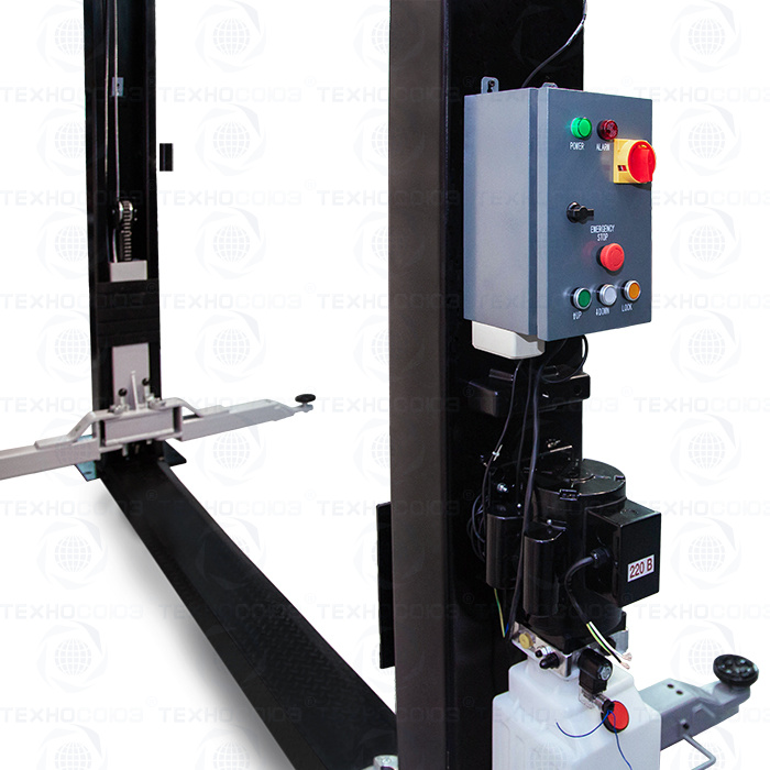 Пульт управления с печатной платой, которая сама управляет подъемником - достаточно лишь нажать кнопку спуска: подъемник сам приподнимет автомобиль со стопоров, отключит их, опустит автомобиль на землю, включит стопора после завершения спуска и при этом сохранит сами кнопки управления безопасными (24 В), в отличие от более бюджетных подъемников, где «на кнопке» - все 380 В питающего напряжения;