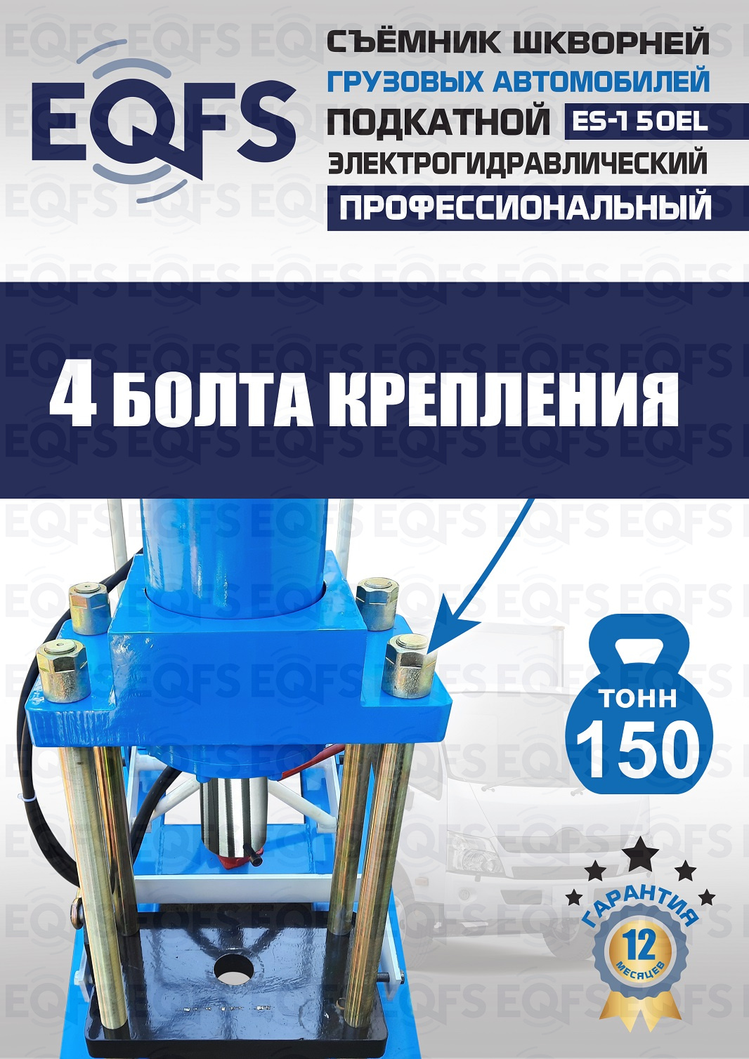 Сокращает время ремонта. Позволяет работать под разными углами 1 человеку. Мобильный. Для выпрессовки шкворней из поворотной цапфы погрузчиков, тракторов, строительной техники, коммерческих и грузовых авто отечественного и импортного производства: MAN, MERCEDES, SCANIA, VOLVO, Корейские и Китайские авто. Электрогидравлический привод. Рабочее окно 400x320 мм. Усилие 150 тонн.