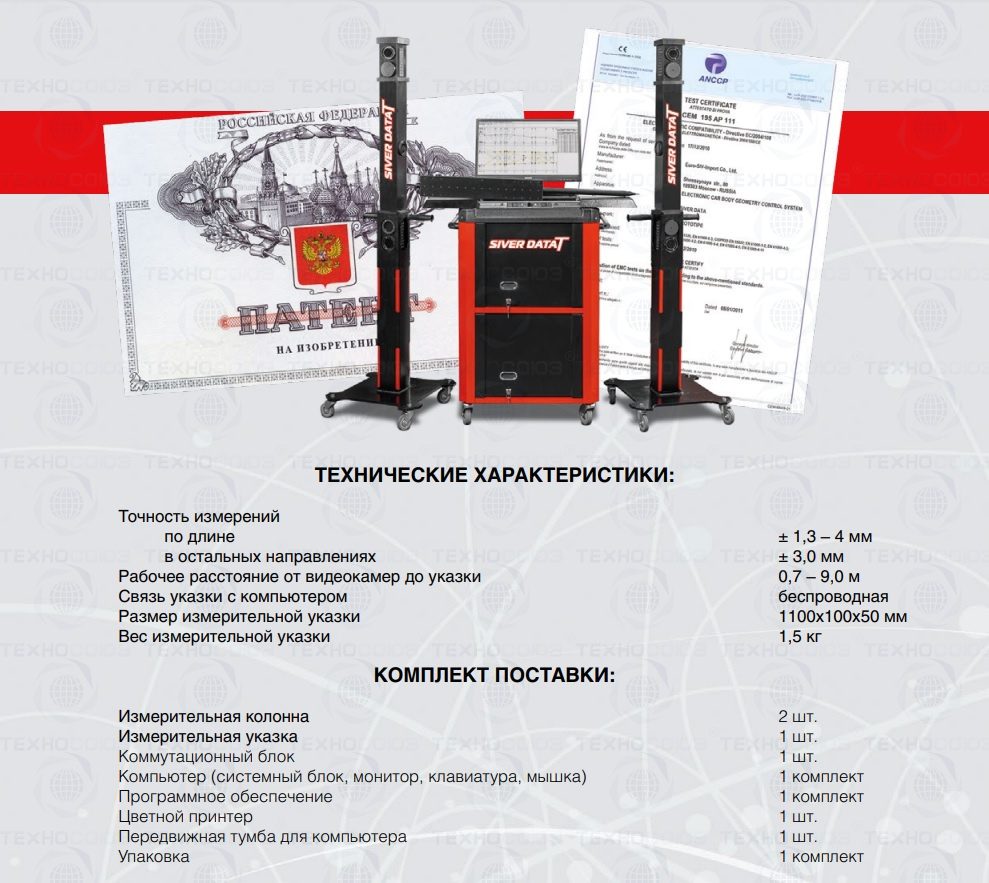 Компьютерная программа “Siver Data” позволяет мгновенно рассчитать расстояние между измеренными точками, проверить на симметрию или показать их смещение от соответствующих контрольных точек из базы данных размеров автомобилей (входит в состав ПО).