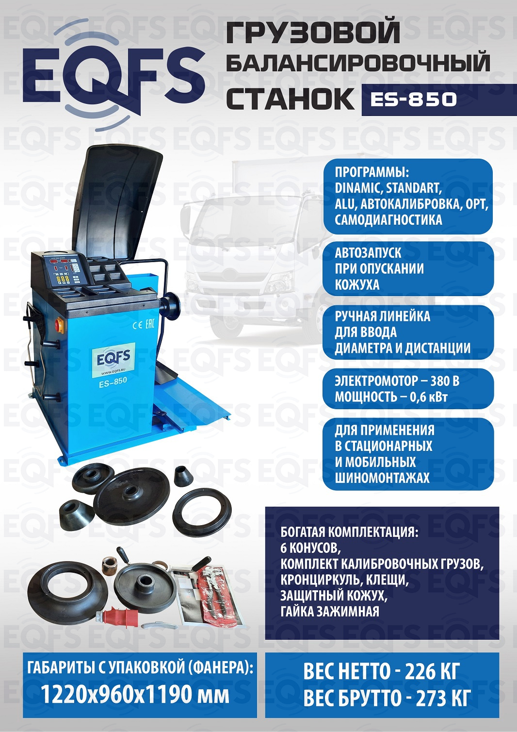 ES-850 Балансировочный станок для балансировки колес легковых и грузовых автомобилей. Колесо «в сборе» Ø до 1200 мм, вес до 150 кг. Диски Ø 13-24” ширина 1,5-20”, подключение 380 В. Встроенный пневмоподъемник. Гарантия до 18 мес.
