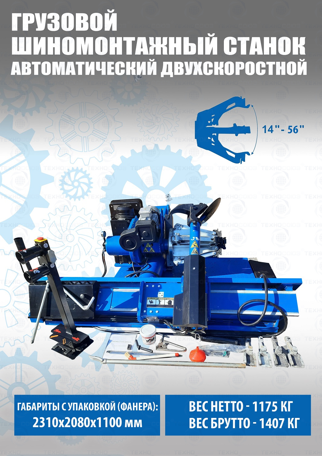 Двухскоростной автоматический грузовой шиномонтажный станок TS-56D для шиномонтажных работ с колёсами автобусов, тракторов, строительной техники с диском 14-56”. Диски ALU, сталь, с кольцом и без 14-56”. Размер покрышки 2500х1200мм, масса до 2000кг. Двухскоростной. Моторы 4 + 4 кВт. Гидравлический насос – Германия «BUCHER HIDRAULICS». Гарантия до 18 мес.