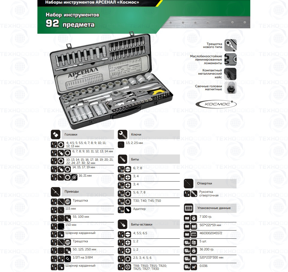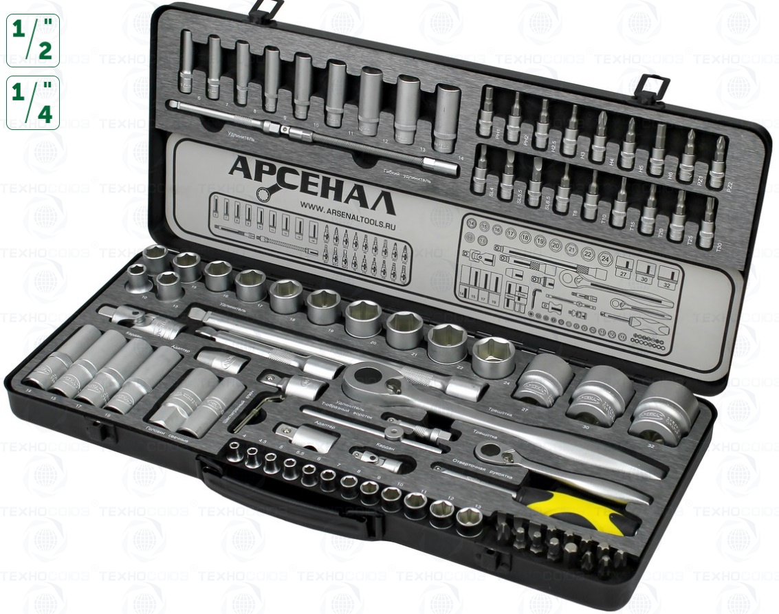 Набор инструментов 92 предмета (М) Арсенал АА-М1412У92 максимальная комплектация данного типа кейсов. Широкий ассортимент бит-вставок и головок, в том числе и глубоких. Сталь, из которой изготовлен инструмент, легирована хромом и ванадием с нанесением никелевого покрытия. Особо прочный кейс из толстой листовой стали с тройным контуром штамповки. Ламинированные грязе- и маслостойкие ложементы. Наборы инструментов Арсенал имеют пожизненную гарантию. Инструмент Арсенал - Специально разработан для Российских условий!!!