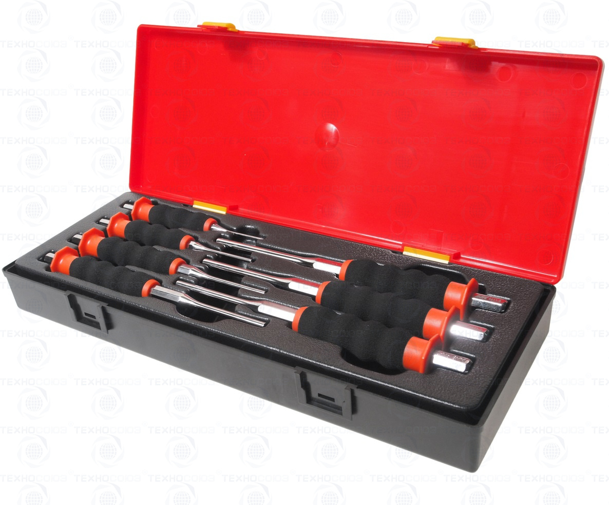 Набор выколоток в прочном презентабельном боксе (7 предметов). В комплекте: (7 шт. выколоток размеры 2, 3, 4, 5, 6, 7, 8 мм). Материал: хром-молибден. Эргономичный дизайн рукоятки.