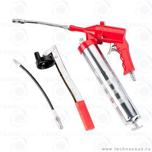 Два наконечника армированный гибкий резиновый и жесткий алюминиевый позволяют производить смазку в труднодоступных местах автомобилей и оборудования. Пневматический нагнетатель изготовлен из легкого алюминиевого сплава и стали. Фиксация съемного бака для смазки производится с помощью резьбового соединения.