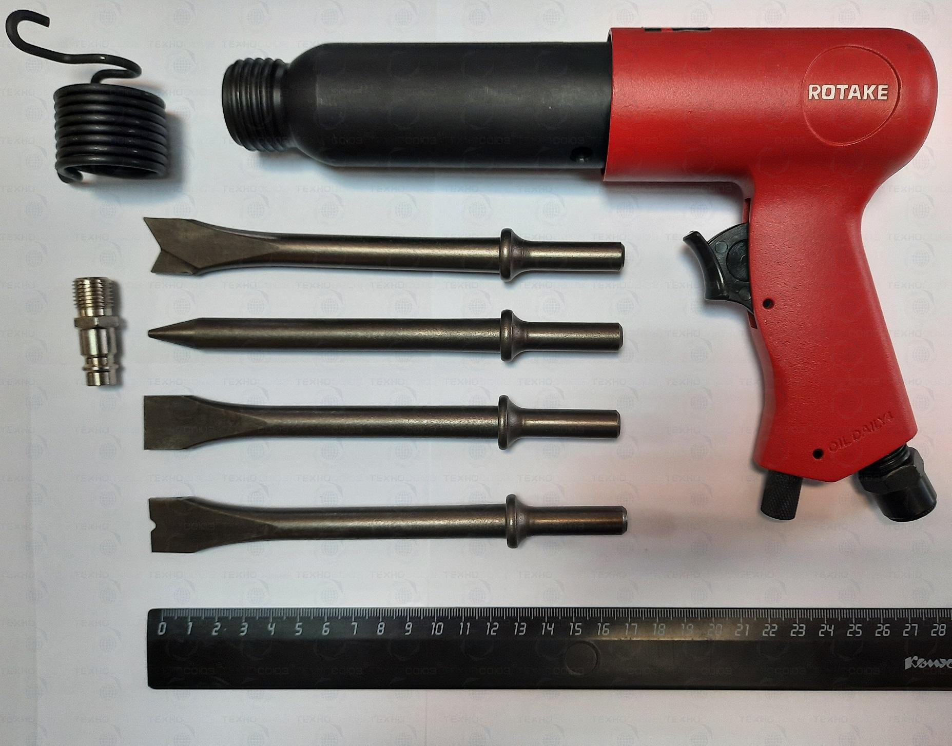 Пневмозубило с набором зубил (4шт.) Ход поршня 92мм. Частота ударов 2200уд/мин. Рекомендуется для резки металла толщиной до 2мм, для кузовных и шиномонтажных работ, удаления клёпок, срезки болтов, гвоздей и т.п. Также рекомендуется для отбойных и демонтажных работ по бетону.