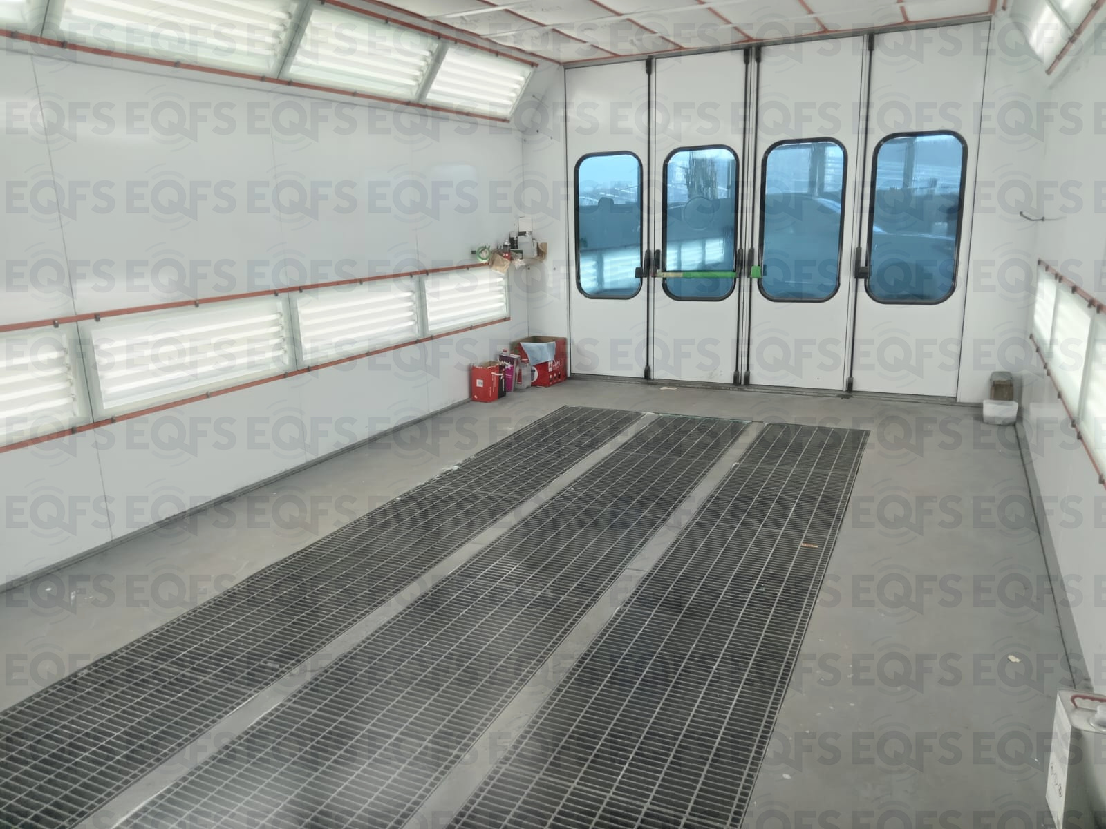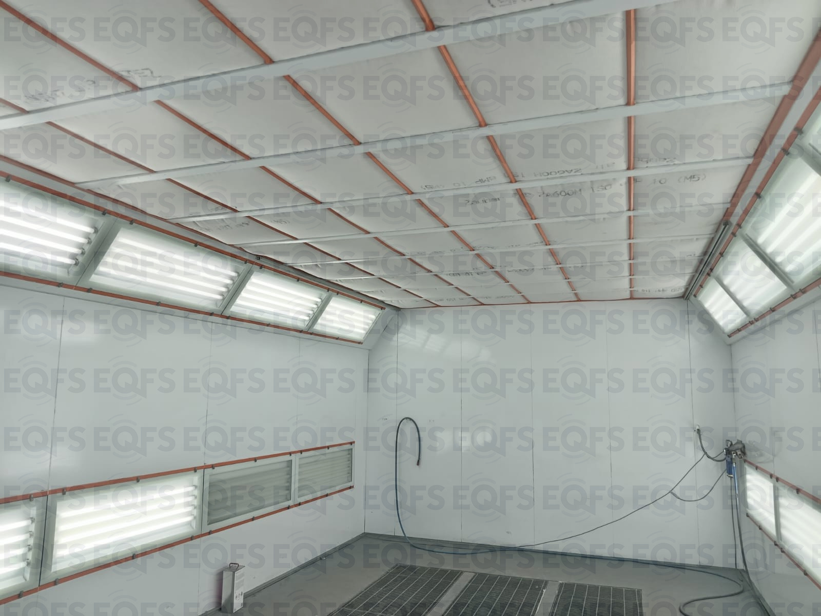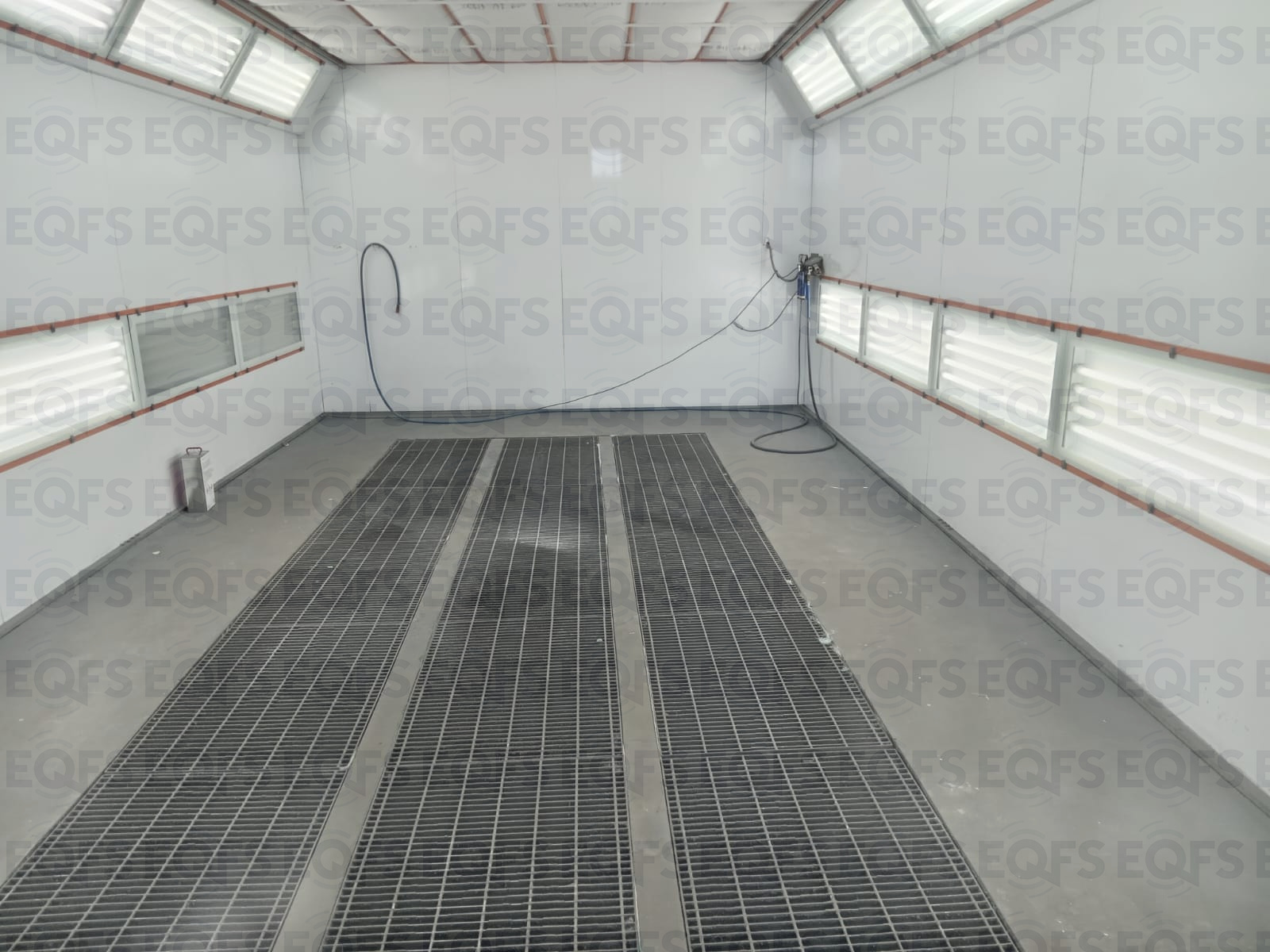 - Утепленных пластифицированных стеновых панелей толщиной 60 мм со специальным антибликовым покрытием - Утепленного потолка - Фильтров тонкой очистки шириной 3,2 м по всей длине потолка кабины - Освещение (3200 Вт): верхнее наклонное – 10 светильников (1600 Вт) нижнее горизонтальное – 10 светильников (1600 Вт) - Въездные ворота: четырех створчатые 3,2х2,65м с четырьмя окнами и калиткой