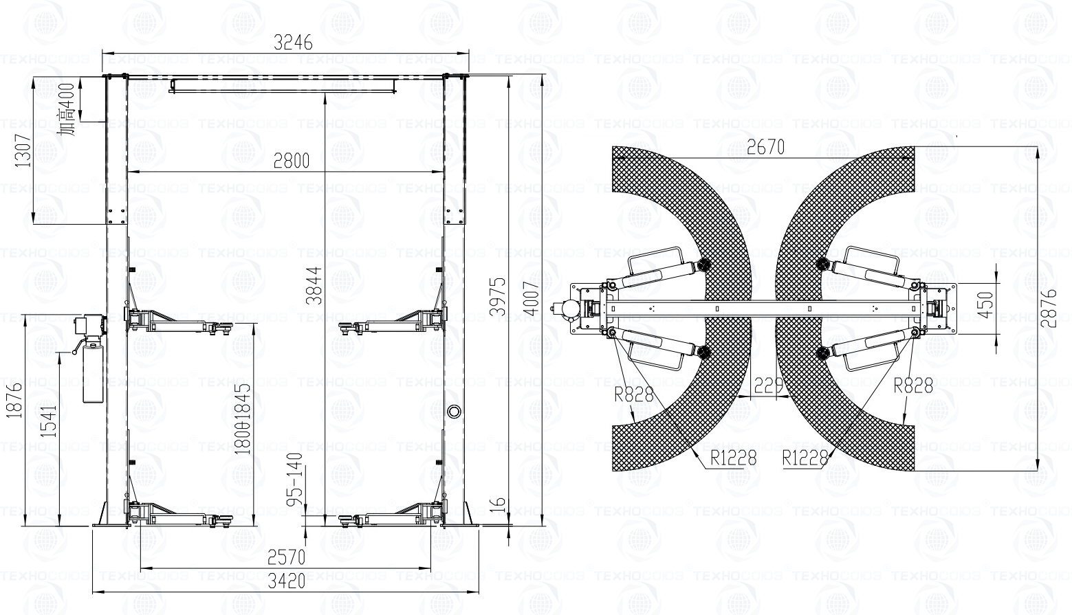 · Большая ширина проезда – 2570мм, позволяет поднимать широкие автомобили в том числе и внедорожники.