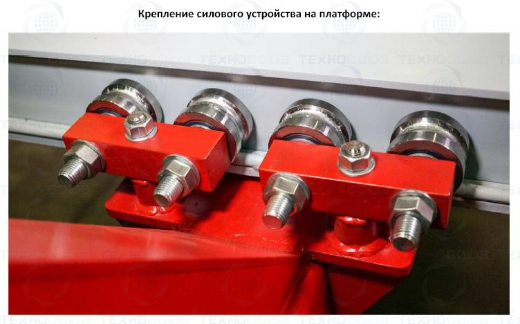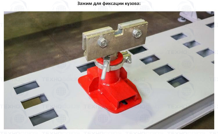 Вдоль всей платформы проходят два ряда пазов для крепления в них фиксирующих стоек, благодаря которым можно закрепить кузов любой конструкции. Платформа имеет выступающие кромки на внешних и внутренних гранях, которые служат рельсовыми опорами для силовых башен. Процедура установки/ снятия автомобиля быстрая и простая. Стапель оснащен гидроцилиндром наклона для заезда .Стапель не требует центровки автомобиля относительно оси рамы,