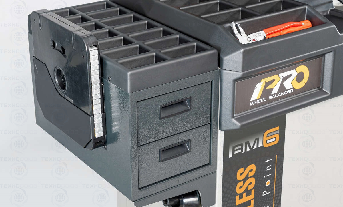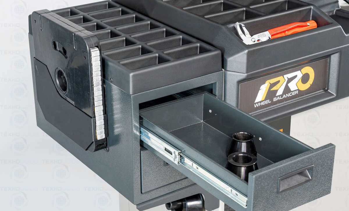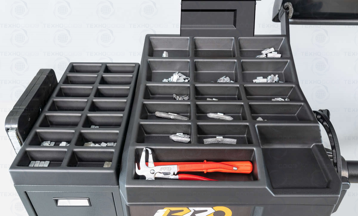 • Основная рабочая поверхность содержит более 29 универсальных ячеек для хранения балансировочных грузов и приспособлений.