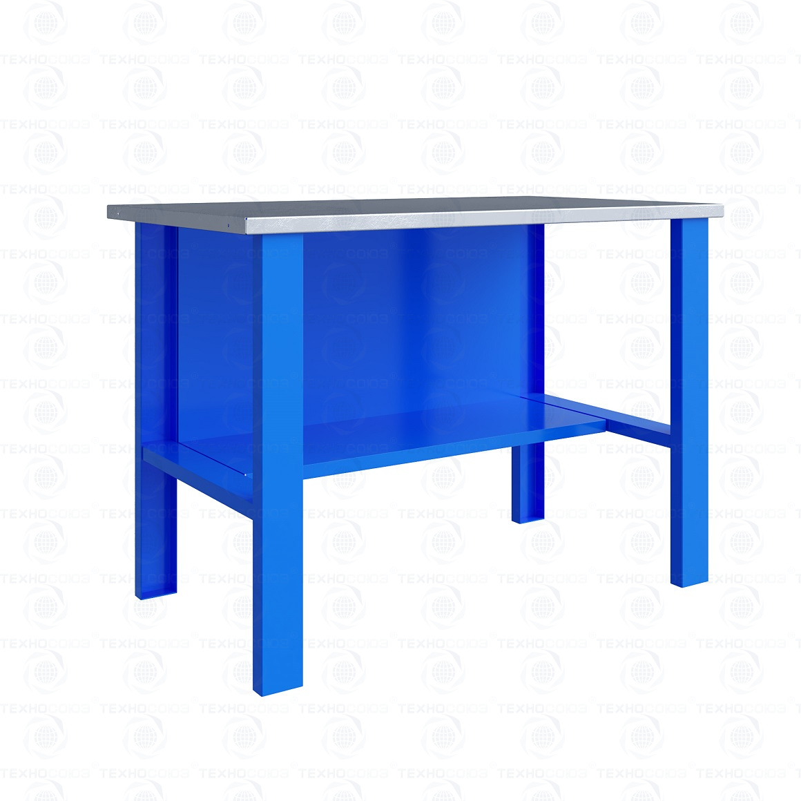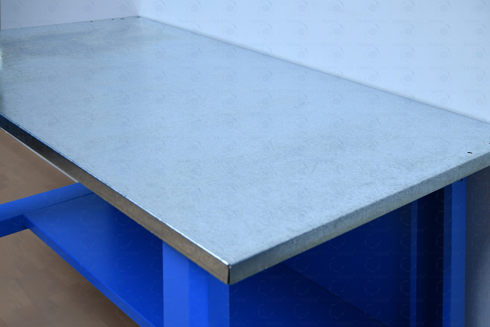 Верстак комплектуется полкой-стенкой, расположенной под столешницей для удобного размещения габаритного инструмента и оснастки. Опорные элементы выполнены сварными из холоднокатаной стали. Все металлические элементы покрыты полиэфирной порошковой краской. Столешница из фанеры толщиной 24 мм, которая покрыта листом оцинкованной стали толщиной 1,2 мм. Глубина столешниц 696 мм. Максимальная масса груза на столешнице - 350 кг.