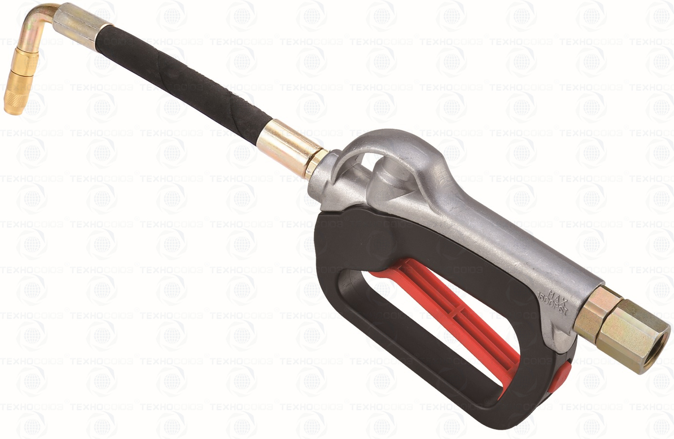 Заправочный пистолет с гибким носиком для масла, ATF, антифриза и технических жидкостей под высоким давлением. Производительность: 50 литров в минуту при рабочем давлении до 100 Бар. Входное отверстие с диаметром резьбы 1/2 дюйма.  Масса: 2 кг. Габариты: 640х300х200 мм. Прочный алюминиевый корпус. Покрытие захвата рукоятки пистолета для масла пластиковое, противоударное. Кнопка-предохранитель спускового механизма. Курок с балансирующим клапаном. Гибкая трубка-демпфер из армированной резины. Носик с анти-капельным затвором.